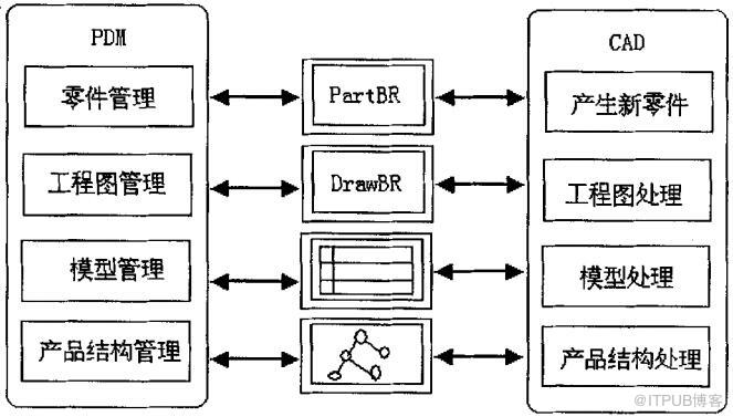 (1)PDM/CAD系统集成基本功能描述PDM/CAD系统集成的核心任务是,将CAD用户的工作结果连同有关的业务对象和数据对象一起构建在PDM数据模型中,使得虚拟产品模型中的描述零部件视图、模型、工程图等的所有业务对象、数据对象和数据成为一个整体。在PDM/CAD系统集成接口中主要完成以下四个方面的集成功能,如图3.2所示。