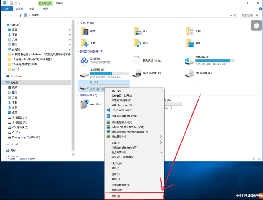 插入U盘,打开”我的电脑“,右击U盘,在弹出的菜单中选择“属性“。(这里以Windows 10系统为例)