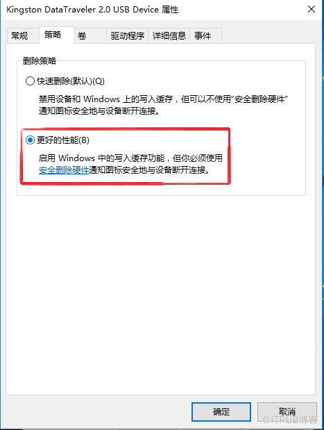 在打开面板中的“策略”选项下,单击选择“更好的性能”,然后点击“确定”。