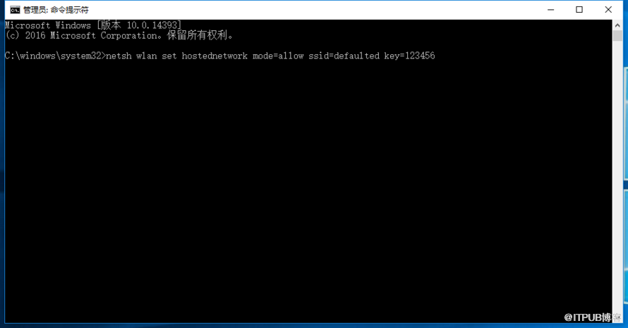 2、在以管理员身份运行的“命令提示符”内复制粘贴输入下列代码——“netsh wlan set hostednetwork mode=allow ssid=defaulted key=12345678”(其中mode是设置虚拟网卡是否启动,allow是选择启动;ssid是Wifi的名称,这里最好使用英文;key是Wifi密码,可以根据自己的需要更改,最好在八个字符以上),然后按下回车键就可以了。