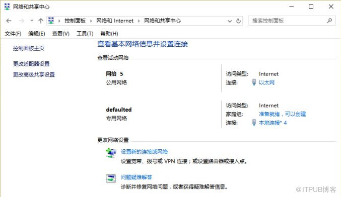 3、再次使用搜索工具打开“网络和共享中心”,点击左侧栏目的“更改适配器设置”来打开面板,找到刚刚设置的网络(小编这里设置的ssid是defaulted),右键单击该网络,选择“属性”,在打开的面板中选择“共享”选项,将“允许其他网络用户通过此计算机的Internet连接来连接”前的方框打勾,然后“确定”。