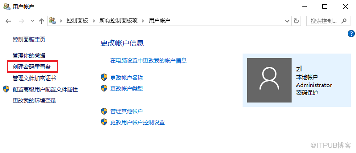 1、插上U盘,打开控制面板,点击打开用户帐户,点击左侧栏中的“创建密码重置盘”。