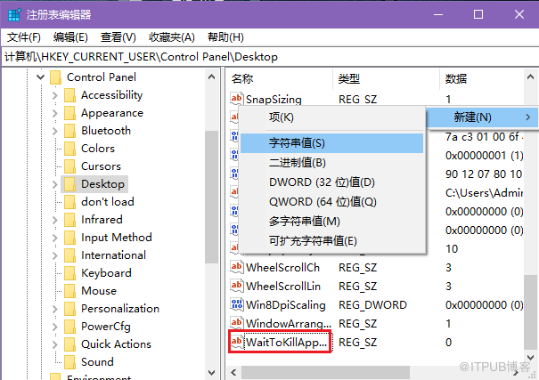 3、在Desktop项的右侧栏中找到WaitToKillAppTimeout项,如果没有,就在空白处右键新建一个字符串值,并命名为WaitToKillAppTimeout。