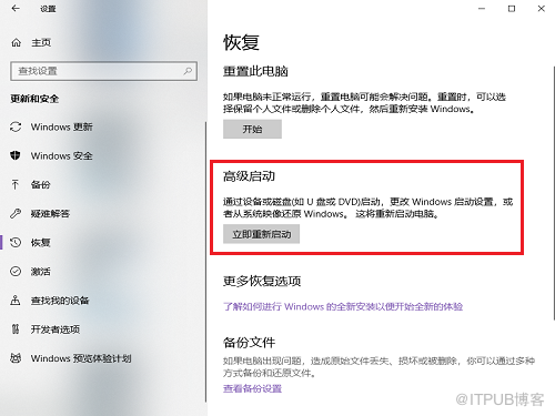 1、在开始菜单中打开Windows设置,选择点击“更新与安全”,在左侧栏中找到“恢复”选项,然后在右侧栏中找到高级启动。