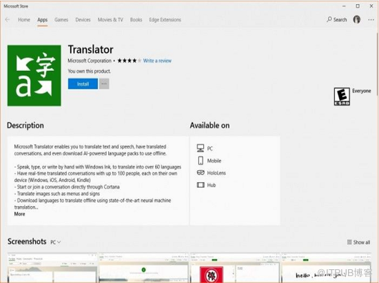 从Microsoft Store列表中我们可以看出,现在至少要Windows 10系统才能安装Microsoft Translator这款应用。