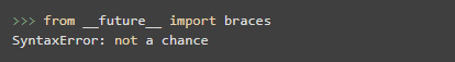 'braces'库也是一个非常程序员的玩笑,它在文档中提到,当在编写 Python 代码时使用这个库可提供使用 C++ 花括号的功能。但当你尝试使用它的时候,你将会看到社区对此的看法: