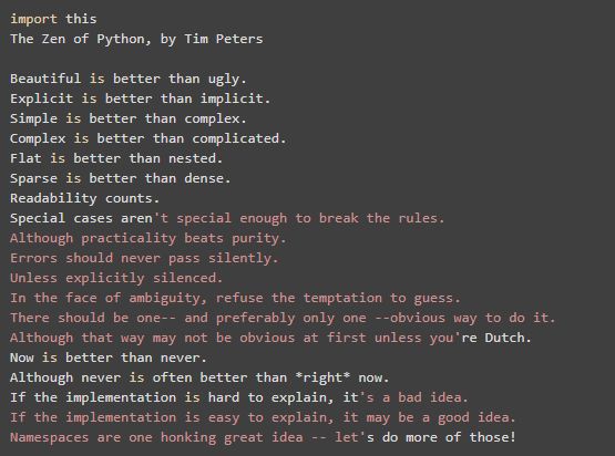 运行此命令将向您展示由TimPeters编写的Python禅,据说这是Pyhton程序员的圣经。