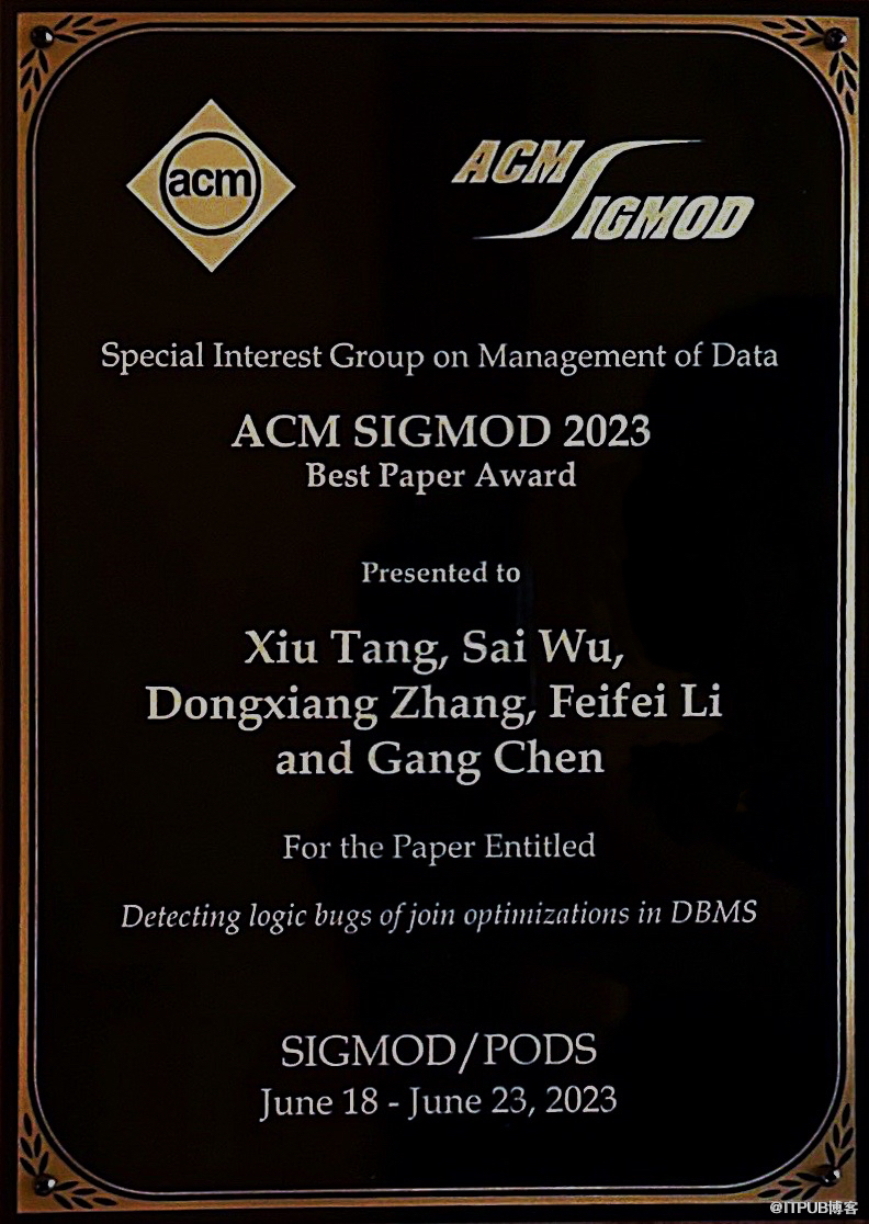 2023年,SIGMOD仅收录190篇论文,由浙江大学与阿里云共同完成的《在数据库管理系统的连接优化器中检测逻辑漏洞》成果脱颖而出,斩获2023 SIGMOD最 佳论文奖,实现了中国大陆研究团队在数据库国际顶会的历史性突破。SIGMOD审稿人评议认为,该工作巧妙、高效地解决了现代数据库的关键问题,即检测出复杂逻辑漏洞,并在业界领先的商业数据库中证明了其能力。