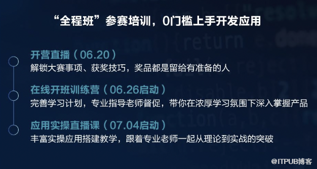 为更好的帮助选手快速入门,比赛还设立了全程班,从0-1的理论到实践教学,包括开营直播课、在线开班训练营、应用实操直播课等各阶段课程,带领选手从入门到精通,最终独立完成软件开发。