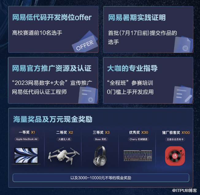 高校赛道的优胜者将获得Apple MacBook Air、大疆无人机、Cherry 机械键盘、HUAWEI 智能音箱或“猪厂”极客奖云音乐会员年卡等奖品。首批(7月17日前)提交完整作品的选手还可获得网易暑期实践证明,最终成绩前十名的选手还可获得网易工作机会,成为一名职业低代码开发者。