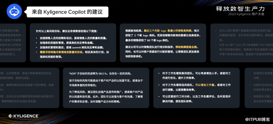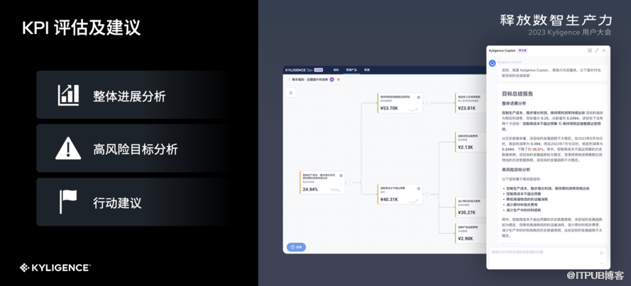 无论是 KPI 评估及建议、归因分析,还是行动建议,大家都可以看到 Kyligence Copilot 其实是特别理性和客观的,都是直接给出基于数据的事实,而这一点是人类很难做到的。从管理的角度来讲,目标的实现非常需要强大的执行力,AI 会辅助管理者监督执行的情况,并且给出建议从而调整执行情况,这就是我们所说的如何以 AI 赋能运营来提升我们管理的潜力。