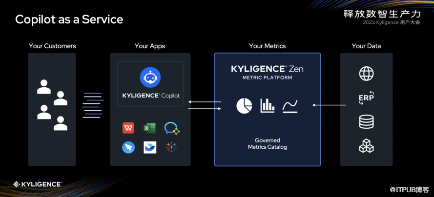 当然仅仅这样还不够,我们希望能够把 Kyligence Copilot 当作 Service 嵌入到大家已有的应用里,快速赋能企业,让大家的应用在最快的时间里拥有 AI 的能力。Kyligence CTO 李扬在接下来的分享中也会介绍如何使用 10 行代码就把 Kyligence Copilot 嵌到你的 SaaS 应用里去。对于企业而言,唯一要做的事就是把你的数据和指标放到 Kyligence Zen 一站式指标平台上来,剩下的事情交给我们,就可以享受刚刚我所演示的 AI 能力。