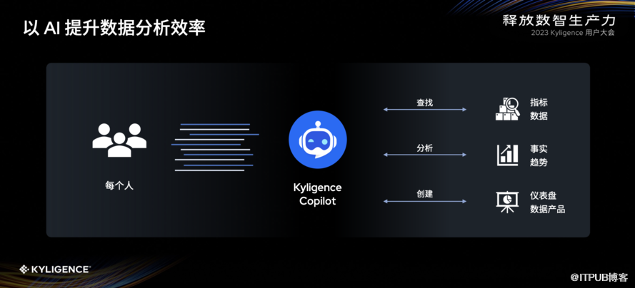 这就是我们主张的“以 AI 变革组织运营与管理”,我们相信 AI 将从效率、经营、协同这三个方面给组织的运营与管理带来变革。这也是构建在 Kyligence 的核心产品体系之上,要让 AI 用得好需要有 Kyligence Copilot AI 数智助理,AI 用得好的前提是构建一个统一、受治理的指标平台,这样人人使用的 AI 数智助理,都能获取统一口径的数据和指标洞察。同时,如果 AI 生成的 SQL 等是不受控制的,如果把这些 SQL 直接扔给数据库,数据库肯定就崩掉了,因此一个受治理的指标平台是很有必要的。