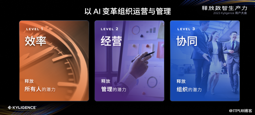 刚刚我其实只演示了其中一个部门和二十多个指标,再放大到企业,可能就有成千上万个指标,作为管理者是很难知道具体什么地方出现问题的,也不可能找到一个人去做这件事。但是 AI 可以解决这个问题!这就是我们主张的“以 AI 变革组织运营与管理”,我们相信 AI 将从效率、经营、协同这三个方面给组织的运营与管理带来变革。