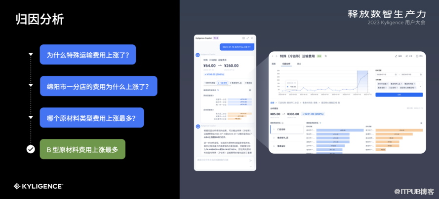 Kyligence Zen 自带归因分析能力,支持层层下钻,找出问题发生的根本原因。举个例子,为什么某项费用突然出现了上涨?在 Kyligence Zen 中你可以层层去问,甚至你不需要主动发问,AI 会提醒你怎么去问、告诉你哪些地方有问题、建议去关注哪些方面等。今天大家可以在 Kyligence Copilot 中问类似“为什么上涨了”这样的问题,我们的 Copilot 将通过 Zen 的归因分析能力,帮助你进一步分析,从而最终找到影响指标的真正的根因。