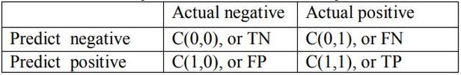 该方法将FP(False Positive)、FN (False Negative)、TP (True Positive)、TN (True Negative)的成本表示为成本矩阵,如下图所示,其中C(i,j)表示对实例进行分类的误分类成本,“i”为预测类,“j”为实际类。这是一个二元分类的成本矩阵的例子。