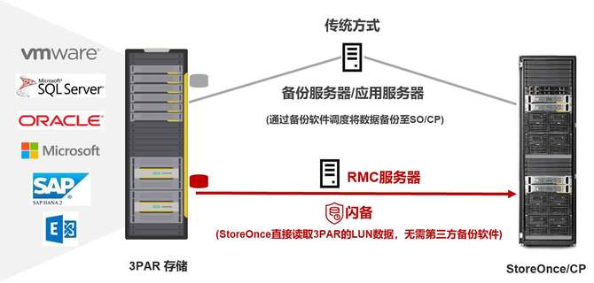 RMC(Recovery Manager Central)闪备 ,是HPE StoreOnce的另外一个极具创新的差异化功能。它可以简化架构,将数据从HPE 3PAR存储直接备份到StoreOnce中,相比传统备份方式,性能提升了约23倍,恢复性能提升了约5倍。无需第三方备份软件,RMC也帮助企业降低了采购成本。此外,RMC没有复杂的备份软件设置,这在很大程度上简化了运维管理操作。