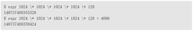 该文件的大小表示可用虚拟内存的数量(可能加上4K),这个解释可能站不住脚。这个数字表明这些系统上的虚拟内存是128 TB!这个数字代表64位系统能够寻址的内存数量,而不是系统上的可用内存数量。通过以下方式进行计算,再加上4 K,就可以推导出这个数字: