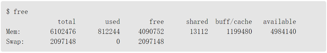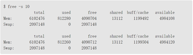 如果你希望得到“这个系统上安装了多少RAM”的答案,那么你可能会对这个报告感到失望,这与上面示例中显示的具有6GB RAM的系统相同。并不表示这个报告是错的,而是系统对它所拥有的内存的看法。free命令还提供了每X秒(在下面的示例中为10秒)更新一次结果的选项。