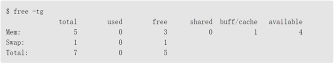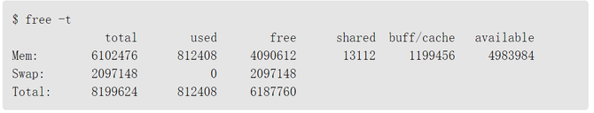 使用-t选项,free显示的值与没有选项时显示的值相同(不要混淆-t和tb),但是在输出的底部添加了一行。