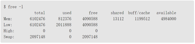 使用-l, free命令可以提供高内存使用量和低内存使用量。