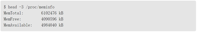 查看内存的另一个办法是/proc/meminfo文件。与/proc/kcore类似,这是一个虚拟文件,它提供了一个有用的报告,显示安装了多少内存、空闲内存和可用内存。显然,空闲和可用并不是一个意思。MemFree代表未使用的RAM,MemAvailable是对启动新应用程序可用内存的估计。