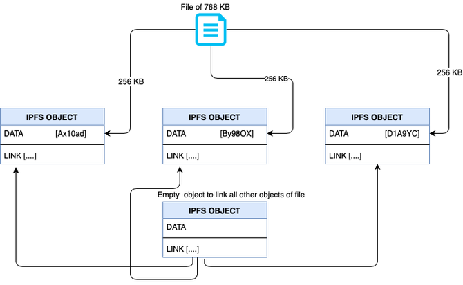 如果我们的文件大于256 KB,那么它将被拆分并存储在多个IPFS对象中,然后创建一个空对象,链接文件的所有其他对象。如下图所示: