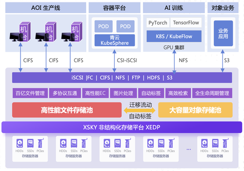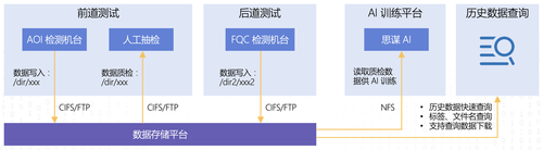 同时,如上图所示,在容器和对象存储之外,星辰天合的统一数据平台 XEDP,通过 SMB/CIFS 文件接口支撑 了深南电路无锡 SUB-B 新厂区所有机台数据存储;通过 NFS 接口对接思谋 AI 平台,直接将机台数据共享给 NFS 做模型训练。