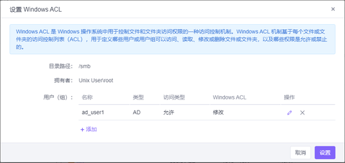 Windows ACL(Access Control List,访问控制列表)是 Windows 内针对某一文件或目录的 ACE(Access Control Entry)集合。每个 ACE 可以针对某一用户或用户组设置允许或拒绝访问某一文件或目录,并设置创建文件、创建文件夹、删除等十余项权限。在对细粒度权限管控要求较高的场景中,需要登陆到 Windows 客户端,连接可访问的 SMB 共享后,通过手工调整 ACL 来控制权限。