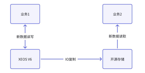 l XEOS V6 利用桶复制功能,将业务 1 写入和删除的 IO 操作复制到开源存储中,业务 2 仍然可以通过访问开源存储来获取已经切换的业务产生的新数据,实现了业务之间的无缝连接和互通。