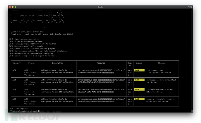 CloudSploit 支持不同的输出,以供其他类型使用指定,CloudSploit 输出不作为表写入。标准输出格式的工具。