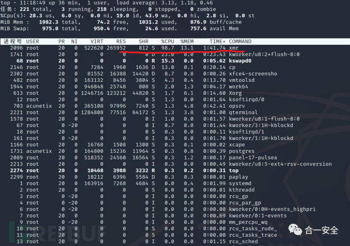 挖矿木马最大的一个特征就是cpu资源占用非常高,top命令查看cpu情况,可以看出xmr这个进程占用cpu资源很高。