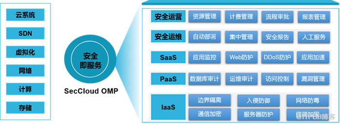 着重提出“安全即服务”的理念,通过安全云管理平台(SecCloud OMP),构建“云安全商店”以满足不同场景、不同租户的安全需求。提供边界隔离、入侵防御、通信加密、服务器防护等覆盖IaaS层安全需求,数据库审计、运维审计、漏洞管理等覆盖PaaS层安全需求,应用监控、Web防护、应用加速等可覆盖SaaS层安全需求,安全服务组件可按需选择、灵活分配、自动部署,并实现弹性扩展。同时,增加运维、运营视角,实现云内安全的可视化和云安全资源的分配管理。