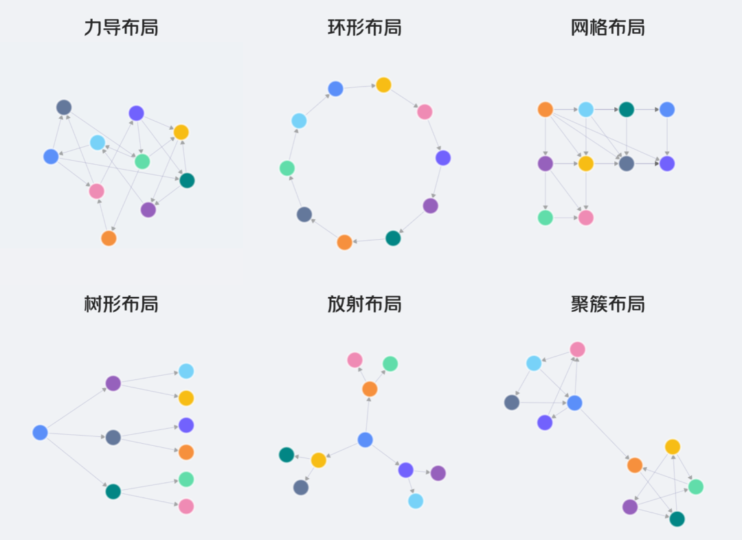 在不同类型的知识图谱中,因数据差异较大,对布局效果的要求也有所不同。能让业务数据有合适的布局来做可视化呈现,是一项比较大的技术挑战。除了下面几种基本的布局之外,我们还探索了一些特定场景下的布局方案。