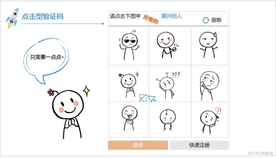 点击型验证码的最大特点是:使用者只需要通过鼠标进行点击,不需要输入任何东西。通过这种人类专属的行为动作,以及使用者在浏览器中的一些操作数据、浏览数据等,共同识别出真正的人类。