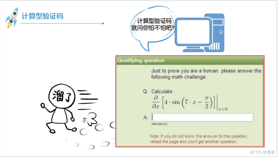 计算型验证码,通常是一些数学公式,需要人类发动聪明的大脑进行复杂的运算,才能得出正确的结果。