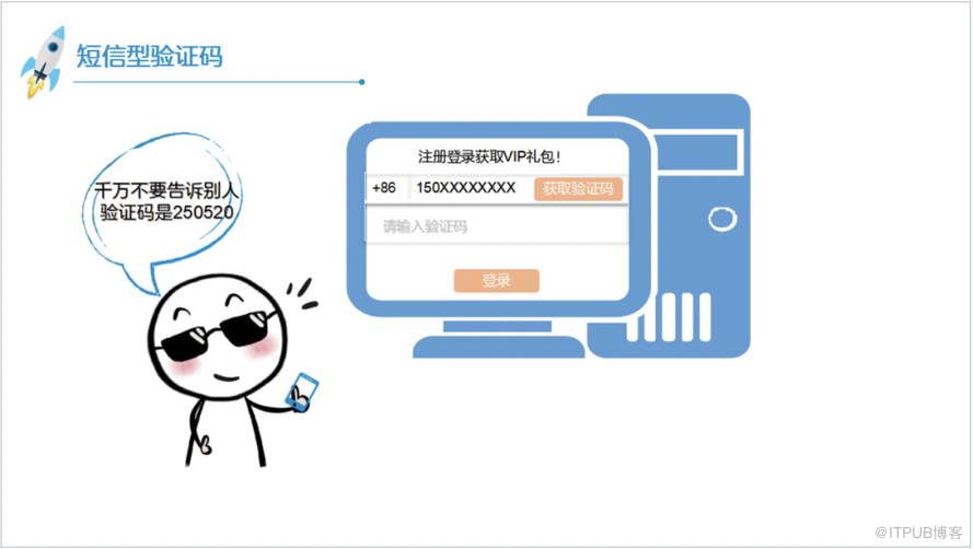 短信型验证码,是最常用的一种方式。各种APP一般会采用这种方式,简单直接,通过运营商来发送短信,安全上有保障。