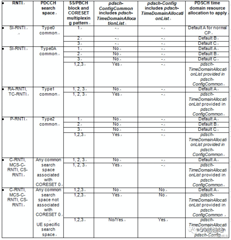 其中Time domain resource assignment的bits数取决于RNTI、PDCCH搜索空间、高层是否在IE pdsch-ConfigCommon或pdsch-Config中配置pdsch-TimeDomainAllocationList相关,如果pdsch-ConfigCommon或pdsch-Config中配置了pdsch-TimeDomainAllocationList,则UE采用pdsch-TimeDomainAllocationList进行时域资源的确定,否则UE根据RNTI、PDCCH搜索空间等信息采用默认的时域资源表进行查表。通过字段Time domain resource assignment的值m用于确定时域资源分配表中的行索引m+1。