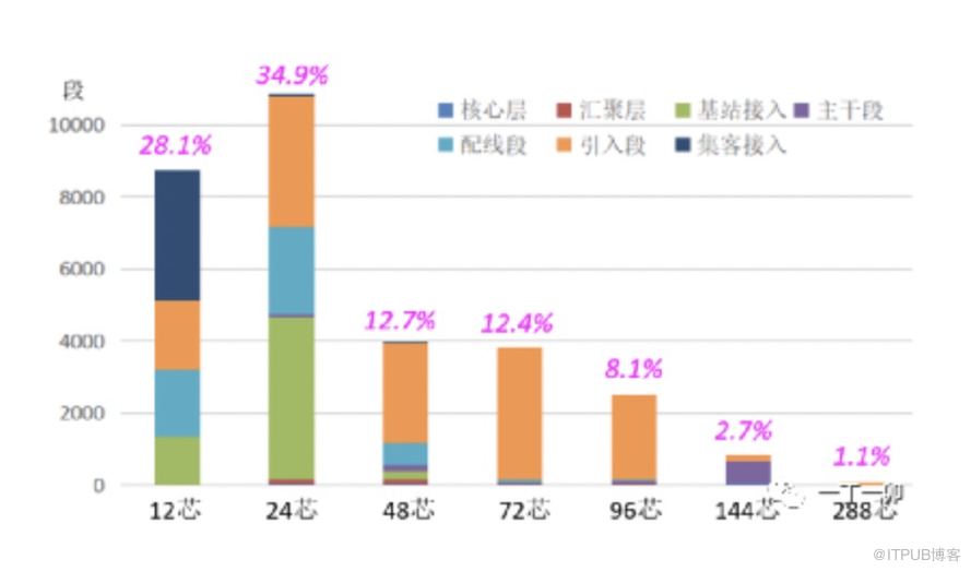 小芯数光缆的芯数是相对于新放光缆的芯数而言的,并无严格的芯数要求。但从控制工程投资的角度,拆除的单条光缆芯数不宜超过48芯。现有已敷设的光缆中,24芯及以下占比超过60%,即使其中10%能进行合并,也可极大地缓解管孔资源普遍紧缺的现状。某四线城市CZ,不同芯数的光缆段落数占比如下图所示。
