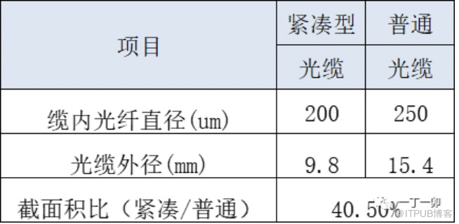 同一型式的光缆,其“最小允许拉伸力”指标主要与光缆的截面积成正比。为达到普通光缆的最低拉伸性能,紧凑型光缆的最小外径通常与普通光缆相当,约为9.5mm。紧凑型光缆的最小芯数通常不小于96芯。以某光缆大厂GYTA型144芯光缆为例,紧凑型光缆的截面积只有普通光缆的40.5%。