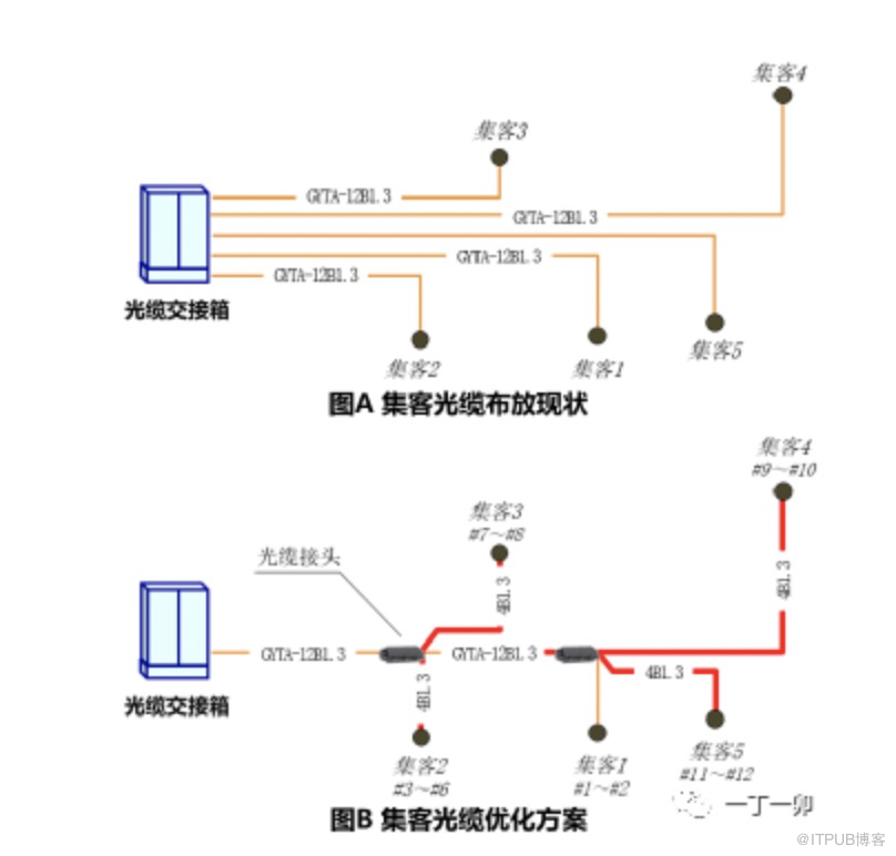 上图中,集客1~集客5中的数字表示集客用户放装的时间顺序,图B中,当集客2~集客5放装时,只需布放从接头盒到集客用户的光缆。