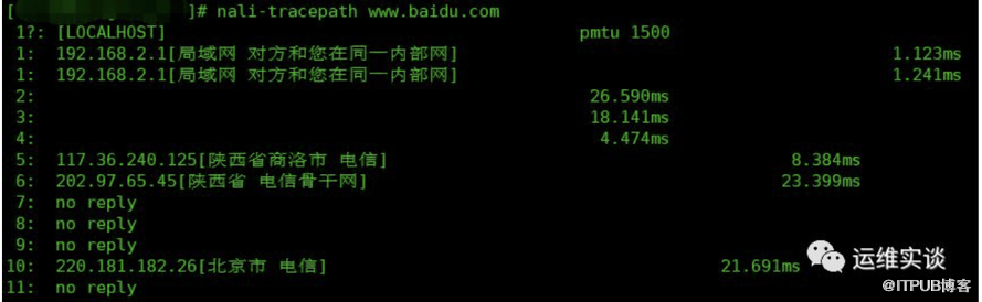 输出中没有回应将作为超时显示(???),这个可能的情况是一些路由器将ICMP丢弃,或者返回线路可能有问题。