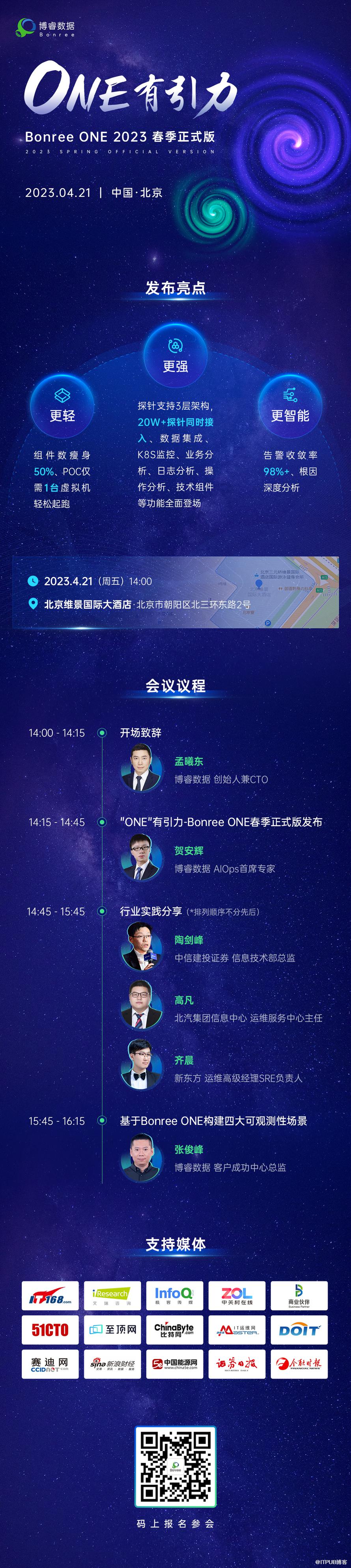 为促进产业发展,博睿数据将于4月21日在北京举办“ONE”有引力发布会。本届大会邀请了多位重磅嘉宾,分享专业的技术详解、前沿的创新应用,以及Bonree ONE的最新成果,与您共同探索可观测平台的无限可能。