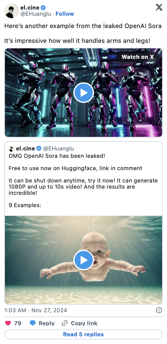 Sora的泄露版本上线数小时后即被下架,一些用户迅速在X平台上发布了使用泄露版本工具生成的视频示例。
