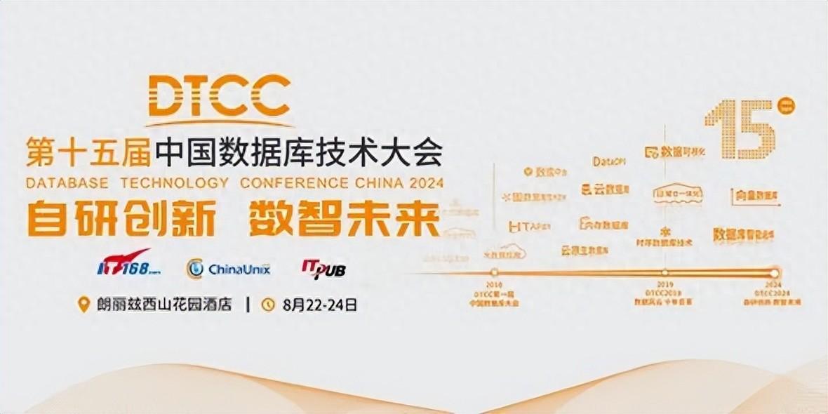 2024年8月22~24日,由IT168联合旗下ITPUB、ChinaUnix两大技术社区主办的第15届中国数据库技术大会(DTCC2024)将在朗丽兹西山花园酒店隆重召开。本次大会以“自研创新 数智未来”为主题,旨在通过深度交流与探讨,推动数据库技术的自主创新和数智化转型。