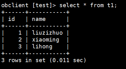 obclient [test]> begin; Query OK, 0 rows affected (0.011 sec) obclient [test]> update t1 set name = "liuzizhuo_all" where id >= 1 and id <= 12; Query OK, 12 rows affected (0.313 sec) Rows matched: 12 Changed: 12 Warnings: 0