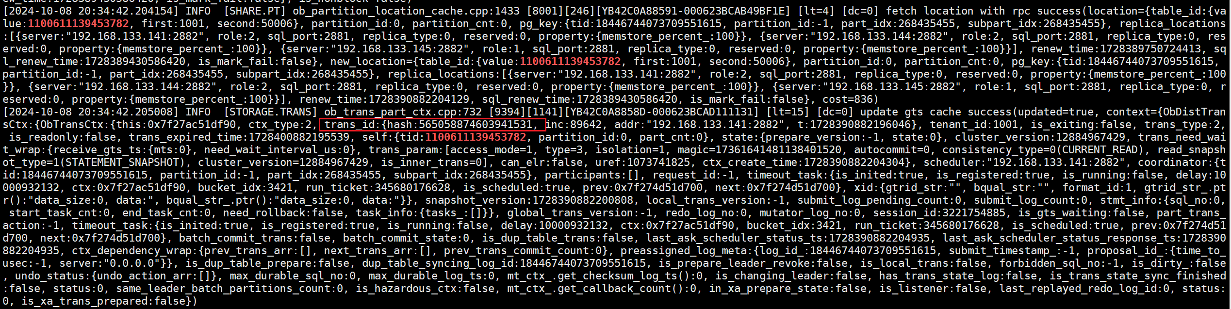 (3)更改其中一行数据,根据tid实时追踪observer.log日志,可看到此事务的事务id是“565058874603941531”,同时可看到这张表的leader是在133.145节点,而会话是在133.141节点上建立的(即scheduler是133.141节点),因此这个事务就是分布式事务。