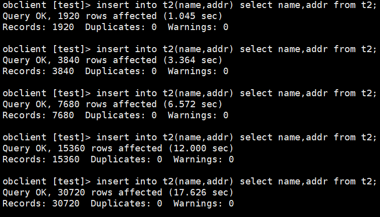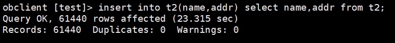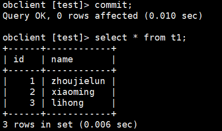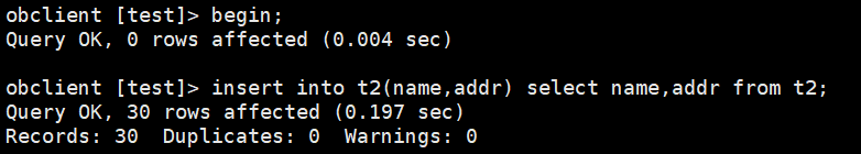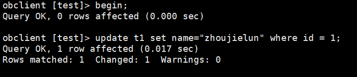 obclient [test]> begin; Query OK, 0 rows affected (0.001 sec) obclient [test]> update t1 set name='liuzizhuo_1-3' where id >= 1 and id <=3; Query OK, 3 rows affected (0.004 sec) Rows matched: 3 Changed: 3 Warnings: 0 obclient [test]> update t1 set name='liuzizhuo_4-12' where id >= 4 and id <=12; Query OK, 9 rows affected (0.007 sec) Rows matched: 9 Changed: 9 Warnings: 0