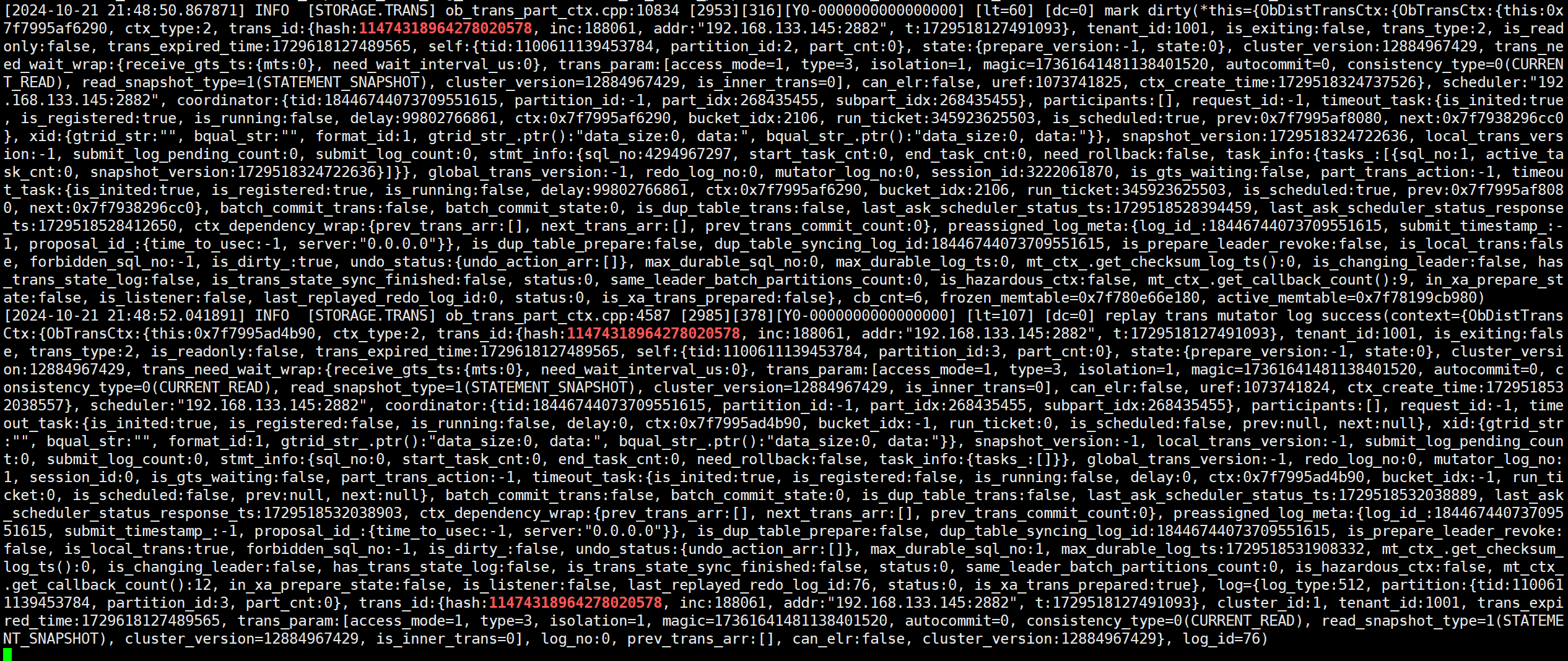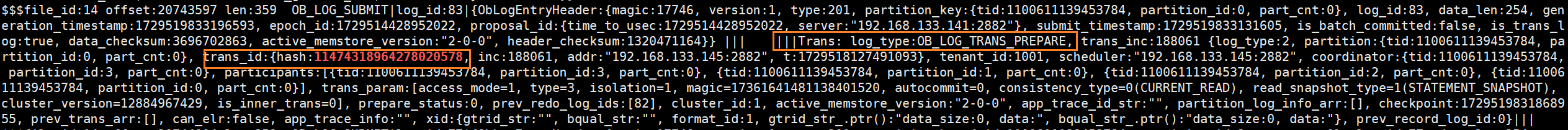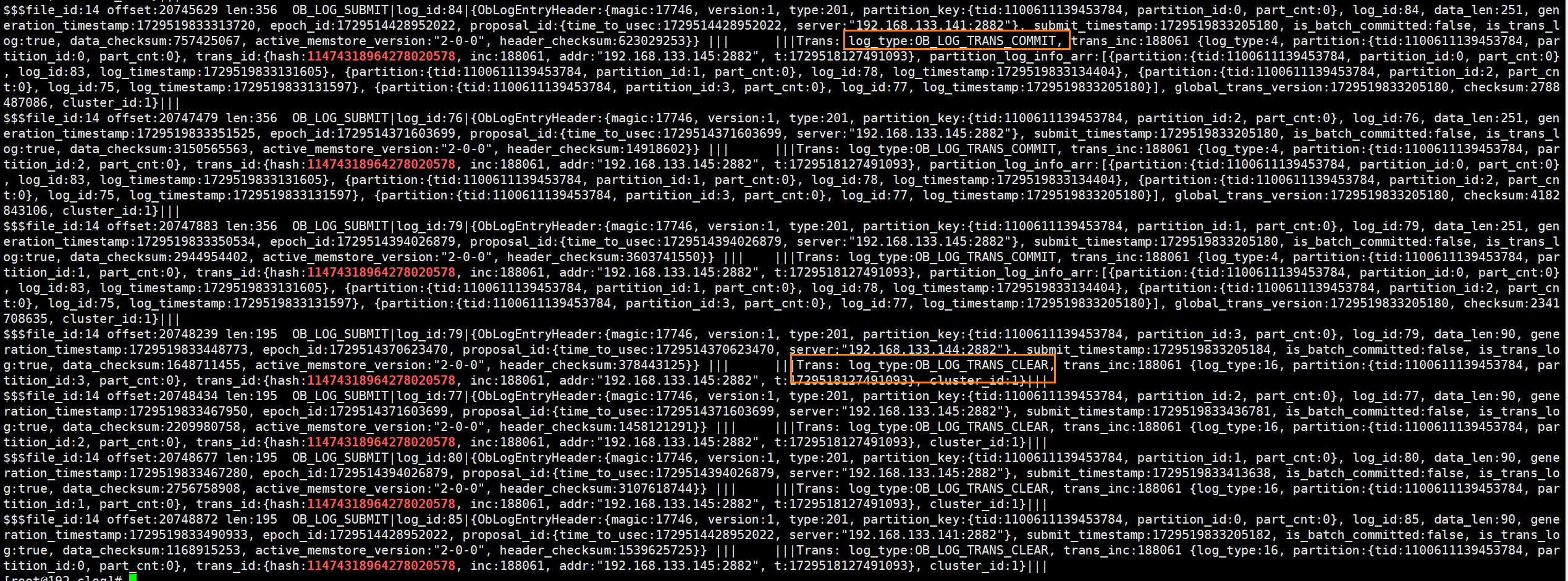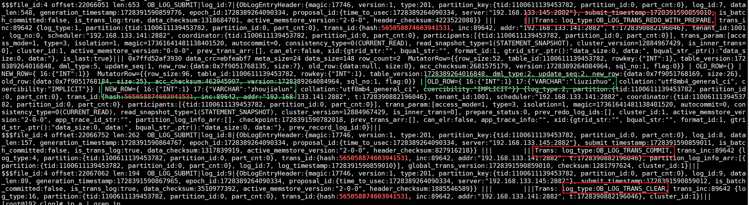 (7)再次根据事务id来grep 145节点的Clog文件,发现文件中多出一条日志OB_LOG_SP_TRANS_COMMIT,该条日志虽然是commit日志,但是其包含了本次事务对于表的修改记录。